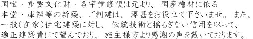 社寺建築の工務店として皆様方にごひいきにして いただいておりますが、勿論、住宅や店舗、 も手がけております。伝統建築技術を現代建築に 生かせるよう、誠心誠意携わらせていただきます。 ●社寺建築を主に 文化財諸堂宇保存修復 ●各宗御本山御用達 ●社寺・数寄屋建築・設計施工 ●官公庁御指定・指名 京都御所等宮内庁(環境庁・防衛庁) 京都府・京都市 元離宮二条城 ●文化財堂宇修復・保存 ●新築・増築・改造・瓦屋根工事等 |